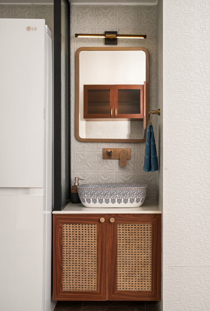 Positioned within a niche, the common wash basin zone is treated as a compact yet expressive design moment. A wooden vanity with cane shutters, a countertop basin, and a framed mirror with subtle brass accents come together against softly textured wall tiles, creating a functional feature that also serves as a visual highlight off the dining area.