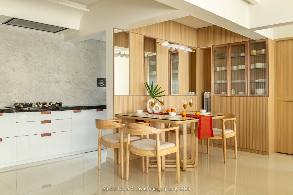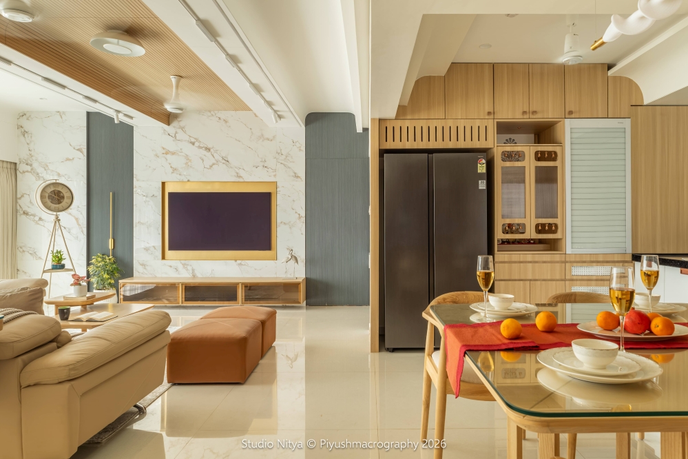 House of तोषण emerges as a nuanced study in balance, warmth, and enduring refinement. Crafted by Studio Nitya, this 1,870 sq. ft. Pune residence is guided by a design philosophy that privileges restraint over excess and material integrity over ornamentation. The interiors articulate a quiet interplay of positive and negative forms, fluted detailing, and layered surfaces that lend dimension while preserving visual calm. A composed palette of ivories, muted greys, teak, and walnut is elevated with brushed metallic accents, creating an atmosphere of understated sophistication. Marble expanses and woven, jute-like textures introduce tactile contrast, enriching the sensory experience without disrupting harmony.