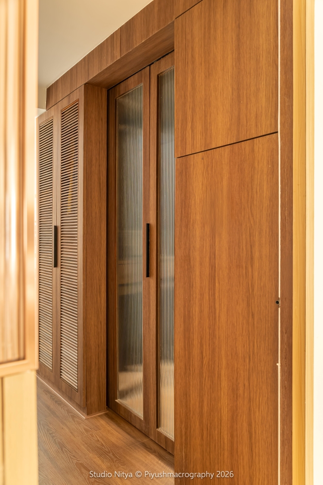 The colour theme and curated artwork work in harmony, creating a balanced visual rhythm. The headboard composition is designed with subtle curves and upholstered accent cushion, adding softness and visual comfort. A minimal wardrobe design featuring linear grooves and concealed teak-wood handle detailing.