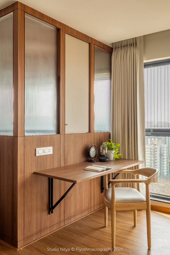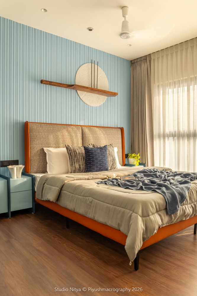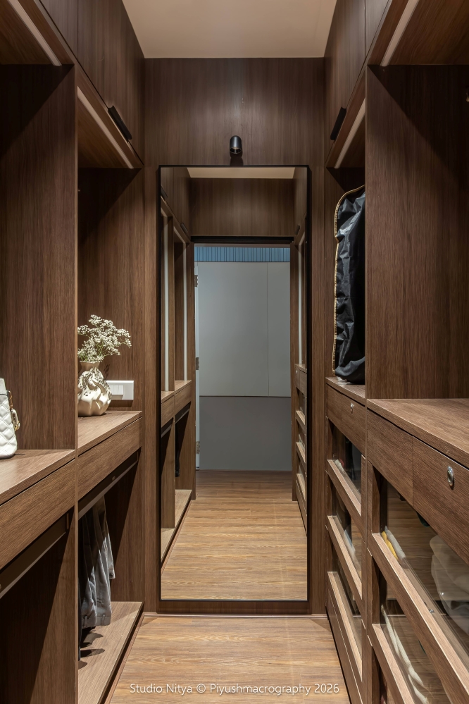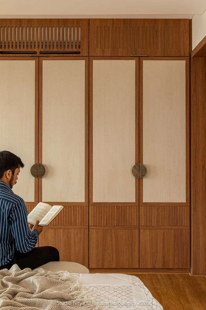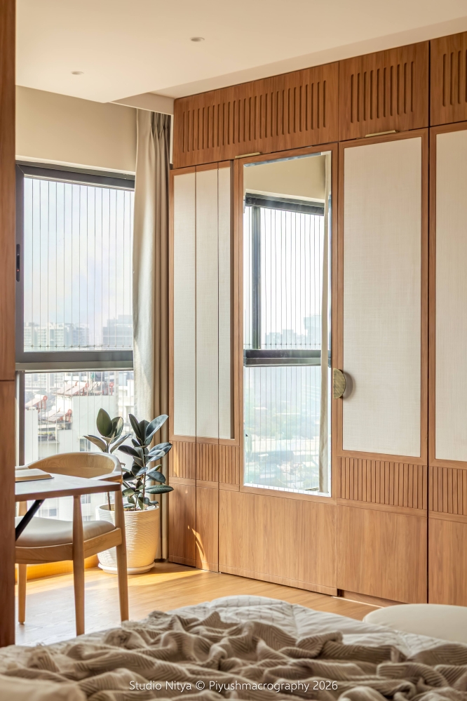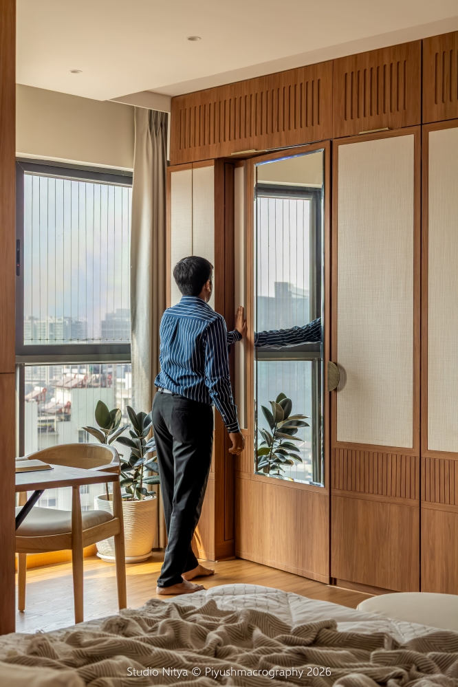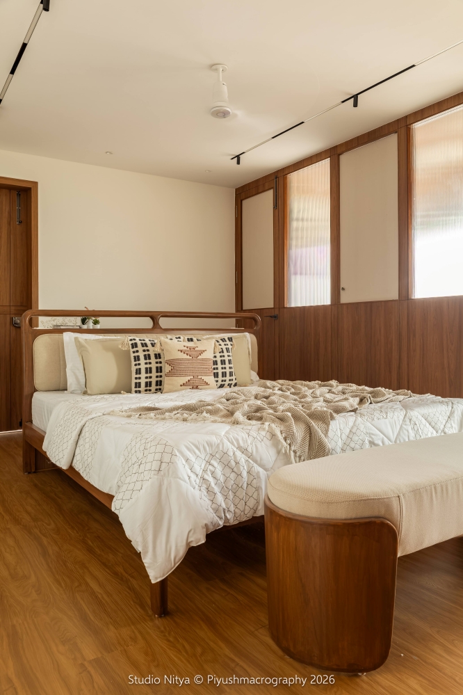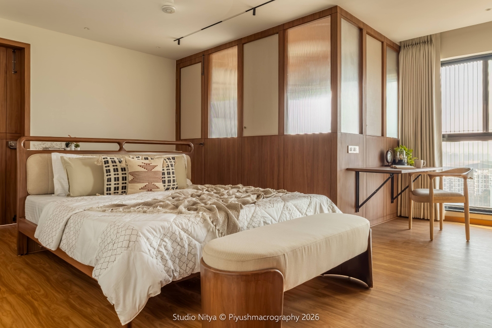 The design language is intentionally restrained, allowing material quality and proportions to define the space rather than decorative excess. A strong sense of warmth is achieved through the use of teak wood furniture, perfectly matched with the wooden flooring. This natural palette envelops the space in a soft, earthy warmth, enhancing the sense of comfort and calm. The room layout is smartly planned, ensuring that circulation remains uninterrupted even with the bed positioned at the center of the space. The bed is supported by a functional console backing, discreetly designed to store surplus everyday essentials, making storage invisible yet accessible.