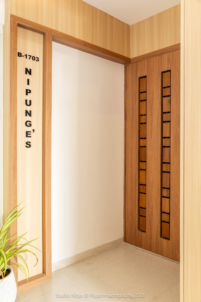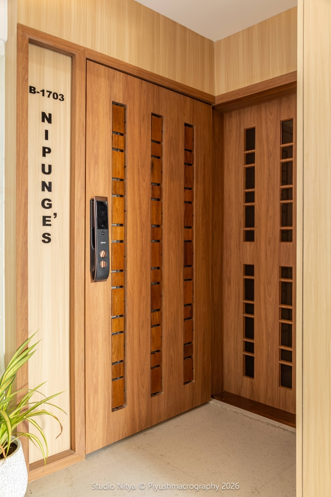 The entrance is designed as a quiet statement of elegance, balance, and thoughtful detailing – setting the tone for the home from the very first step. The design explores a refined positive–negative concept in doors. The safety door jali, crafted through waste wood cuttings, becomes the positive element – a textured, sustainable design expression that adds rhythm and depth. In contrast, the main door precisely aligned cut-outs backed with dark brown painted glass, creating a layered negative that introduces visual depth and subtle drama. This alignment establishes a strong design dialogue between the two doors while maintaining visual continuity.