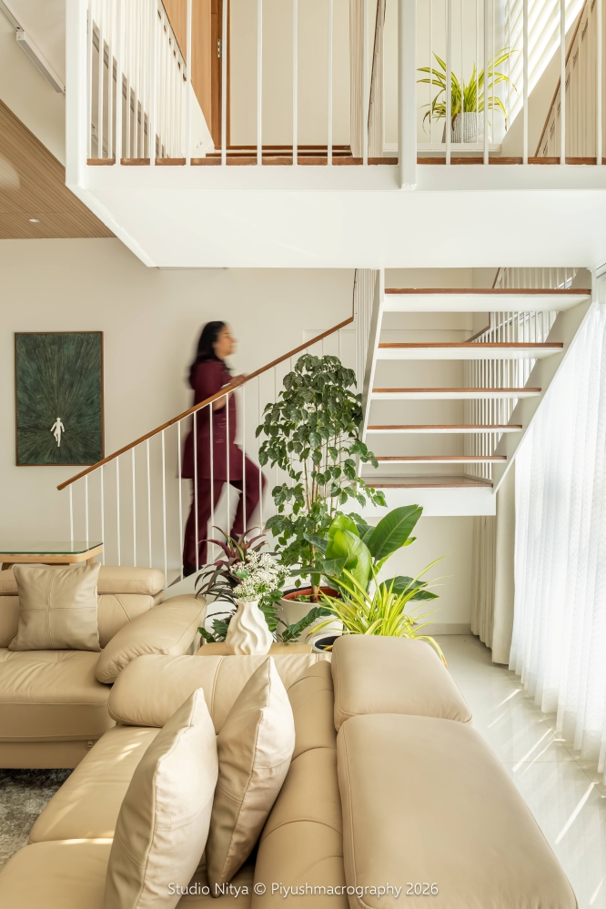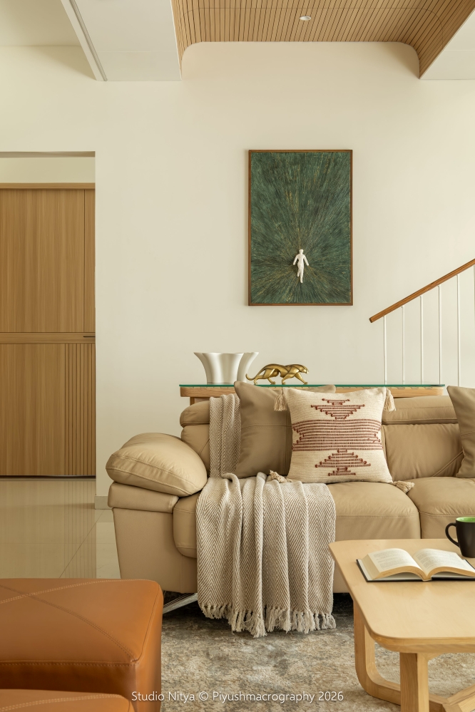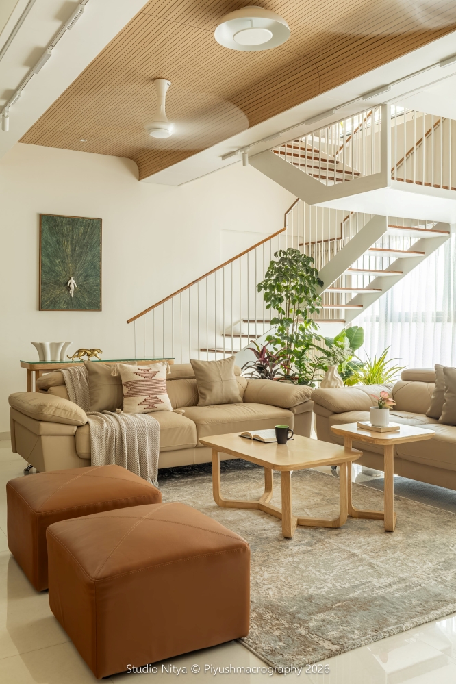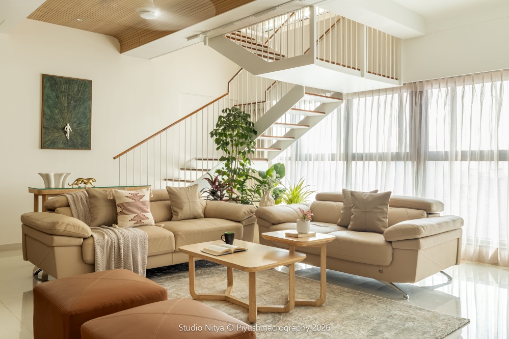 The monochrome furniture palette flows seamlessly with the surrounding curtain fabrics, beige upholstery, wall tones, and warm wooden finishes, creating a harmonious and visually balanced environment. A key architectural challenge of the exposed RCC staircase beam has been smartly transformed into a design feature by mirroring it with a dummy beam and introducing a curved shallow wooden ceiling with fluted detailing. This design move not only creates visual symmetry but also adds rhythm, depth, and architectural character to the space.