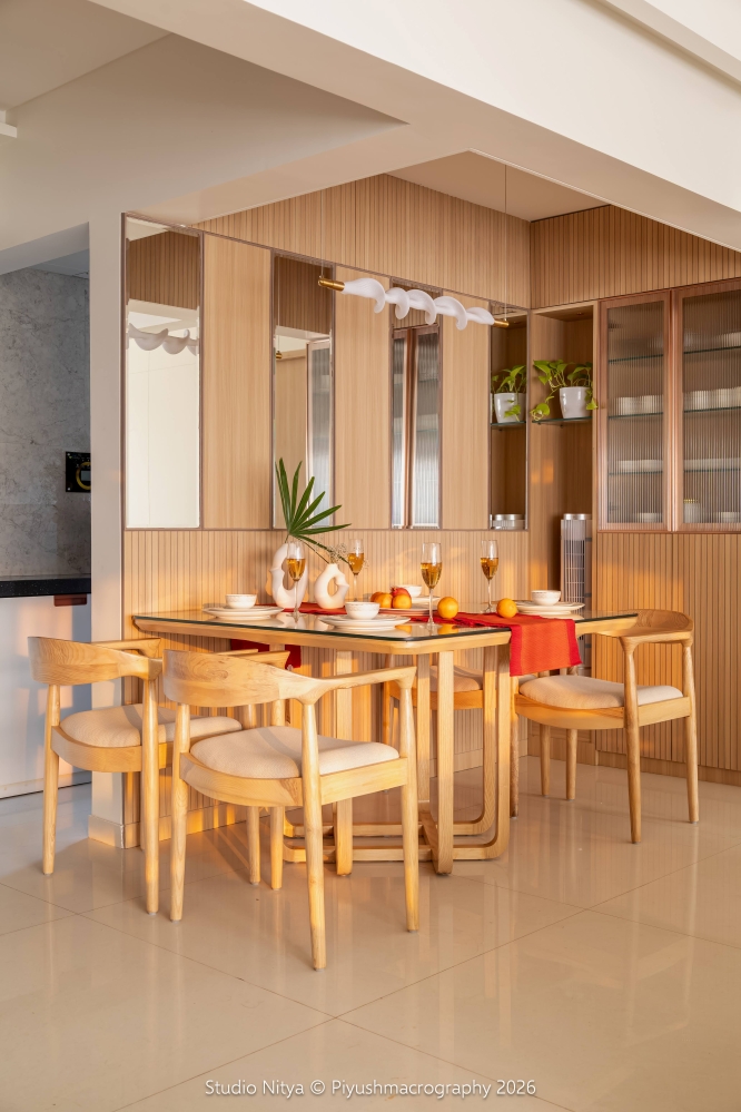 The dining area flows effortlessly between the living room and the kitchen, making it a highly user-centric and spatially open zone. This open planning enhances movement, interaction, and visual connectivity, creating a naturally spacious environment. The dining backdrop is defined by a fluted wood paneling combined with mirrors, adding depth, proportion, and refined detailing without visual heaviness. The crockery unit is subtly concealed within this composition — its fluted glass and linear detailing seamlessly blending into the wall panel, making it feel integrated rather than imposed. Completing the space is artistic elongated fiber hanging light, which acts as a sculptural element while softly illuminating the dining zone.