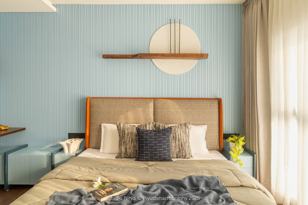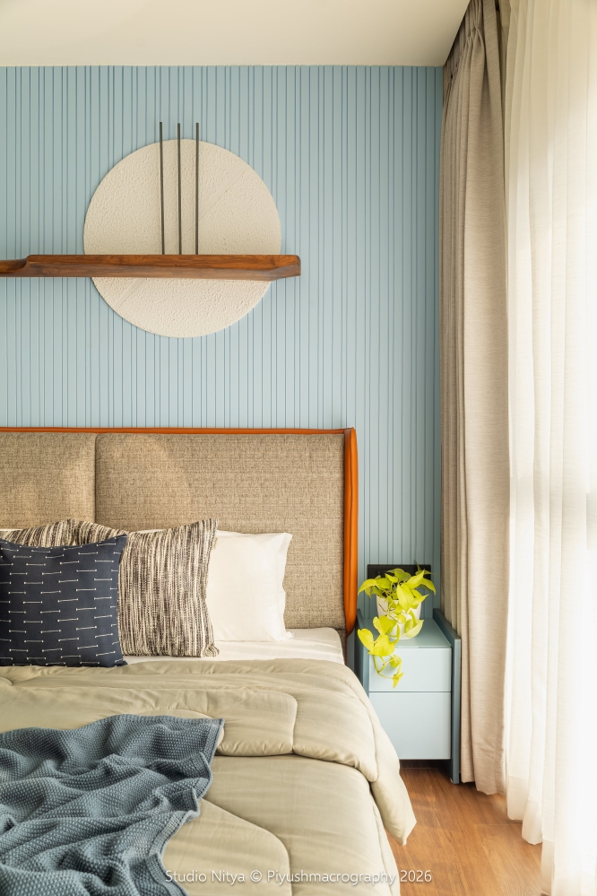 This fluted language continues into the bedroom design through the blue fluted wall panels, establishing a rhythmic backdrop that defines the identity of the room and structured visual cadence. The room’s most striking narrative element is the bespoke cricket-inspired mural installation. Instead of conventional player wallpapers or graphics, the design introduces a 5.5-foot long custom teakwood cricket bat, paired with a textured cricket ball and sleek minimalist stumps, transforming the wall into a sculptural, artistic tribute to the son’s love for cricket. This installation also serves as a display shelf for trophies and achievements.