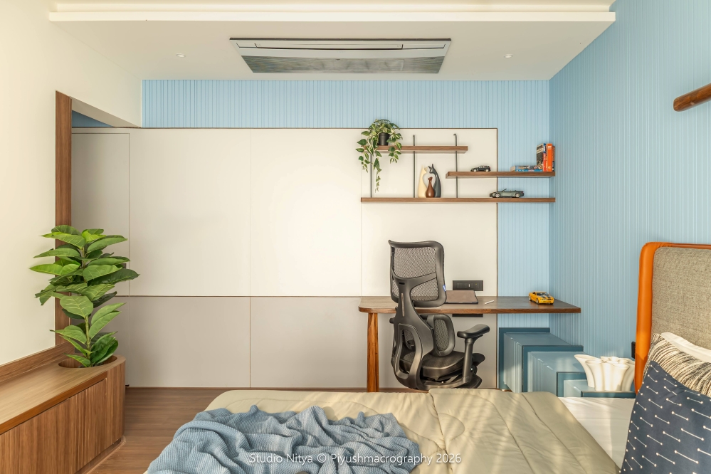 The study zone reflects playful personalization — the custom table leg detail subtly references a cricket bat form, while the open floating shelves are to showcase the son’s car collection, books, and personal objects, blending function with identity. Opposite the bed, a minimal wooden ledge is designed as an informal seating and gathering space for friends, encouraging interaction and relaxed social moments.