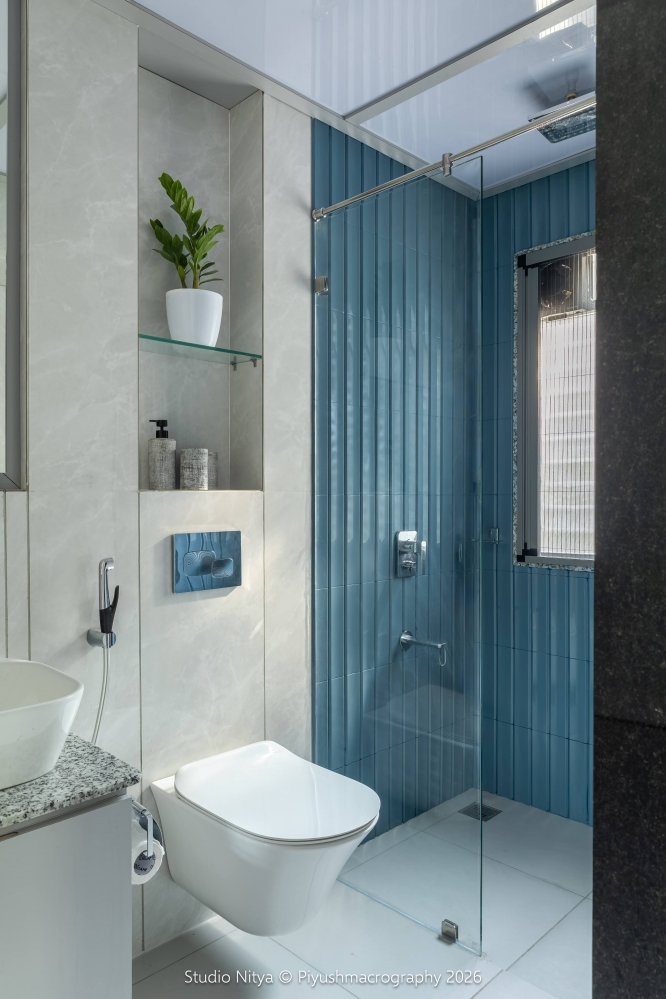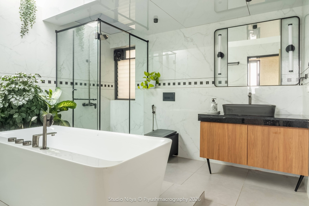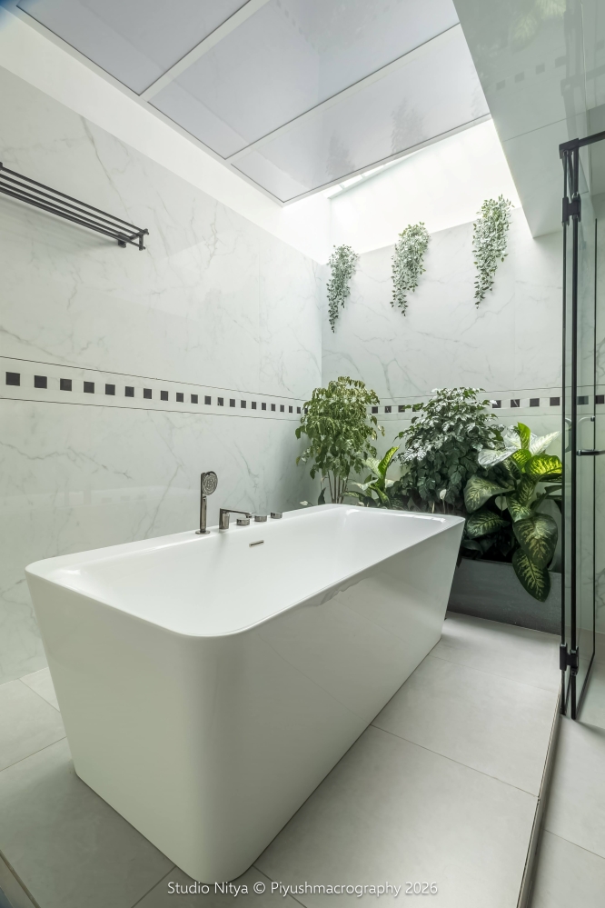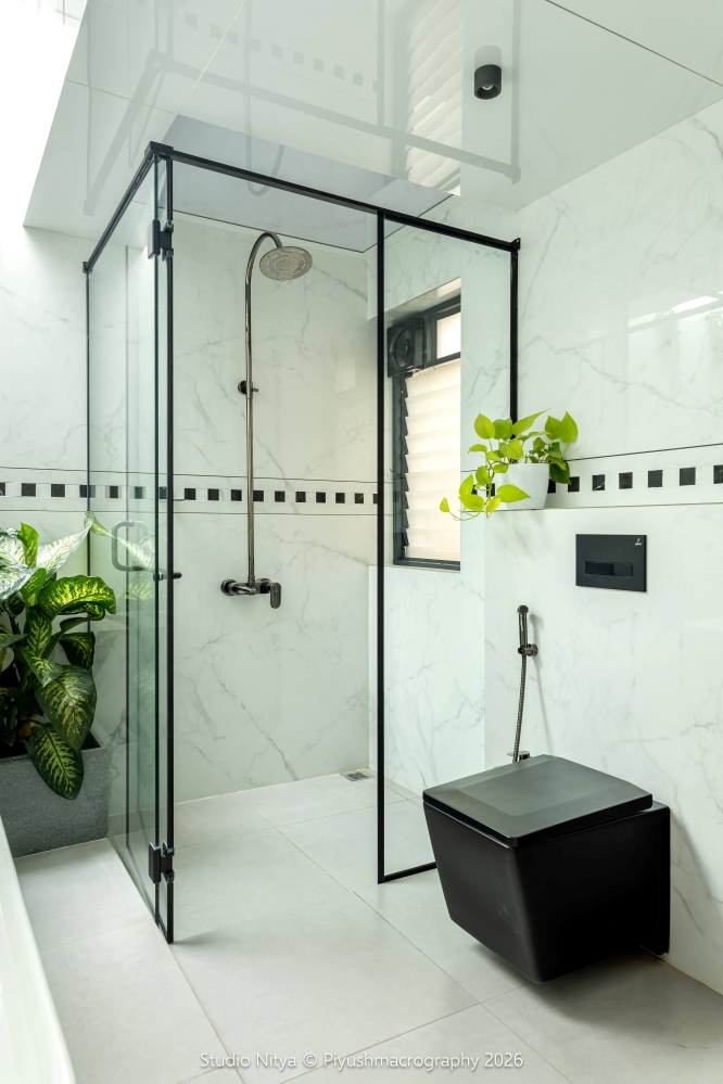 This master bathroom was created by extending into an unused terrace area, transforming it into a naturally lit, serene wellness zone. The extension is covered with MS roofing, with a strategically designed skylight cut-out that allows soft, indirect natural light to filter into the space. The palette is kept simple, with grey matt floor and white satvario tiles on the wall. A slick geometric inlay pattern is introduced to break the monotony of white. The bathtub zone is designed as a calm focal point, framed with indoor plant greenery and natural light, creating a spa-like ambiance. To contrast the light surfaces, all-black fittings and glass partitions are used, giving the space a contemporary identity.