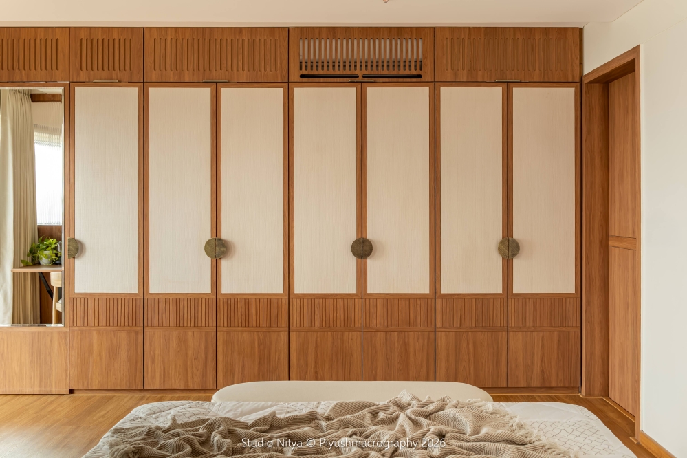 The wardrobe spans along a 15-foot wall, yet never overwhelms the space due to its minimal modern ivory jute-fabric and wooden finish, which softens its visual mass. To balance the simplicity of the shutters, antique accent handles are introduced. Within this wardrobe composition lies a concealed door to the master toilet, integrated so seamlessly that it reads as part of the wardrobe wall. At the foot of the bed, a soft ottoman seating creates a casual interaction zone — a space for quiet conversations and relaxed family moments.