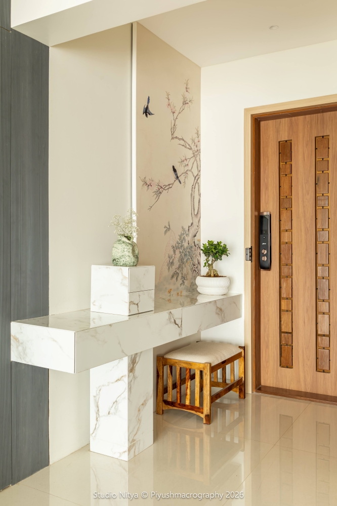 The entrance lobby functions as both an accent zone and a user-centric transition space. A sculptural marble-finish console with hidden drawers discreetly accommodates daily essentials such as keys and utilities, keeping the space visually clean while enhancing everyday functionality. A soft-toned nature-inspired wallpaper panel, depicting birds and delicate branches, introduces calmness, simplicity, and a subtle reflection of the client’s love for minimalism and nature. Together, the entrance and lobby become more than a threshold.
