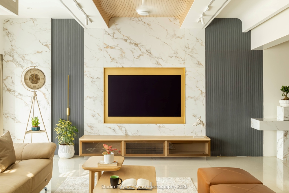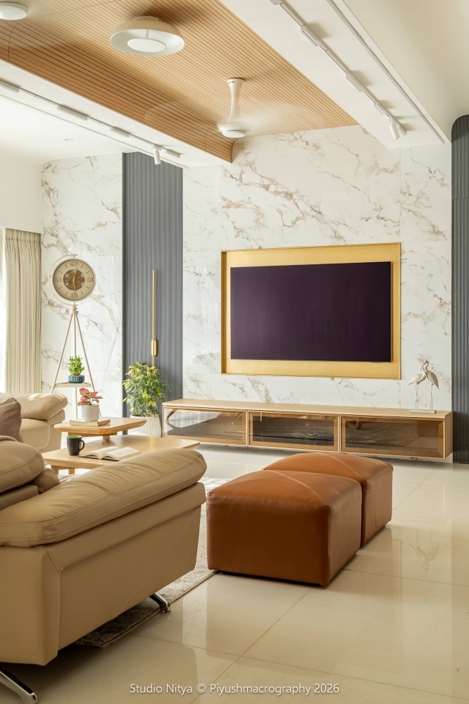The living room is a warm and emotionally grounding space where modern elegance meets everyday comfort. The design is defined by a material contrast between marble-finish wall tiles and grey fluted panels, creating a sophisticated yet subtle visual composition. A brushed gold niche framing the TV unit adds a gentle luxury accent, giving the focal wall a distinctive identity.